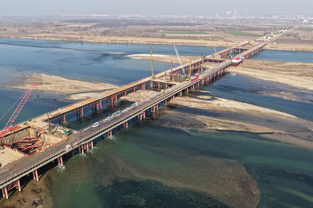 与此同时,新建焦济洛平铁路洛阳黄河公铁大桥建设现场也是塔吊林立,机械轰鸣。工人们正在进行钻孔桩、承台和墩身施工,全力赶工期。