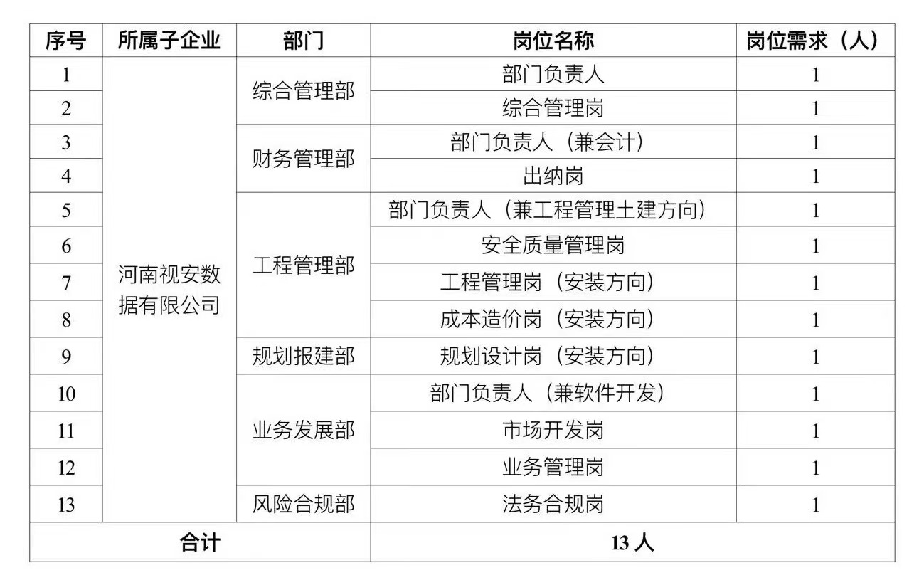 根据河南铁建投物流有限公司工作计划,为满足河南视安数据有限公司项目建设运营人才需求,确保数字物流综合服务多式联运智慧枢纽项目建设、仓储、信息化服务等高铁物流业务顺利实施。现面向社会公开招聘13人,有关事宜公告如下: